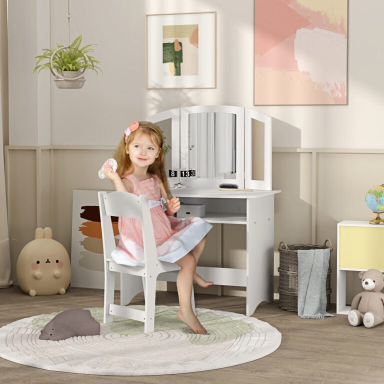 Transform your little princess’s room with the Qaba Kids Dressing Table Set! This charming vanity table features a tri-fold mirror for all their primping needs and doubles as a makeup or writing table when you remove the top. Complete with a chair and storage shelf, it’s a delightful addition to any playroom or nursery.