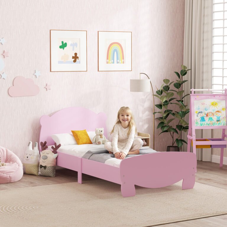 Transform your little baby’s room with the Qaba Kids Bed, a bed for toddler designed for ease and safety. Its low height provids easy access, while elevated sides keep the mattress in place. Adorably topped with bear-shaped head and footboards, this bed for kids supports growing children from ages 3 to 12, making every bedtime a delightful adventure.